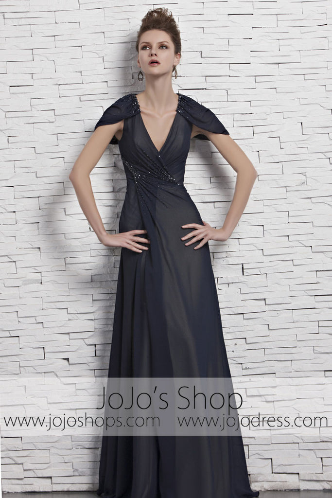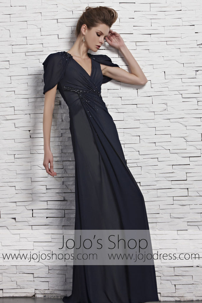 Navy Blue Short Sleeves Chiffon V Neck Evening Formal Dress CX881533