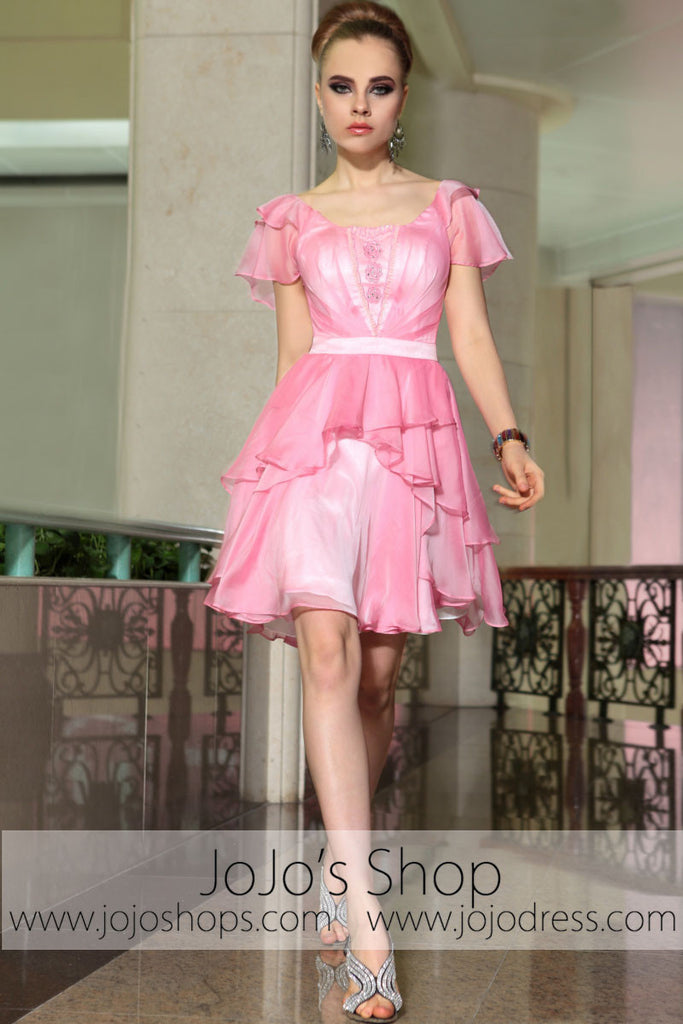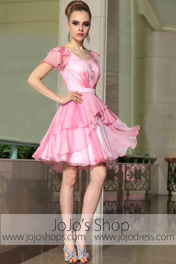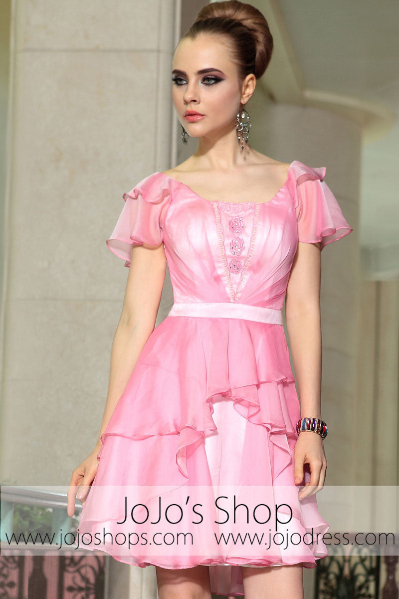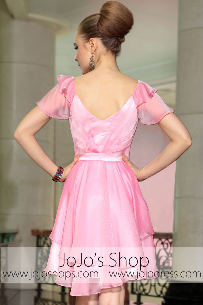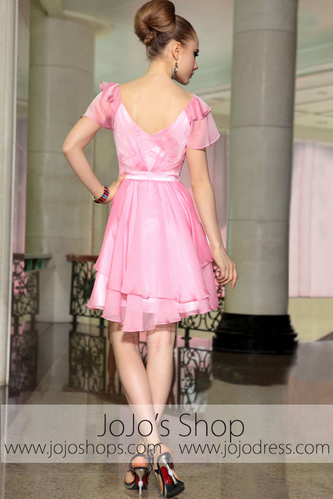 Pink Ruffle Short Butterfly Sleeves Bridesmaid Evening Cocktail Dress DQ86057