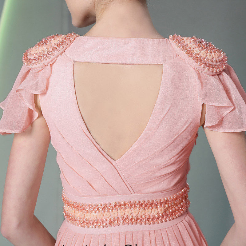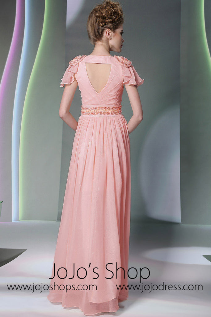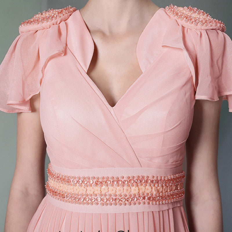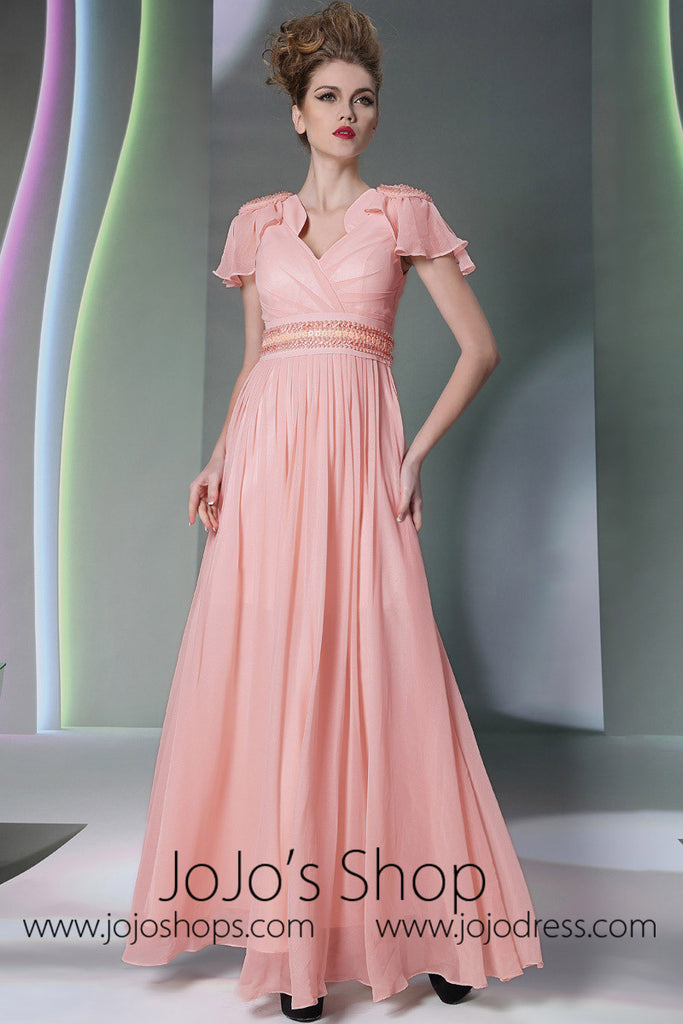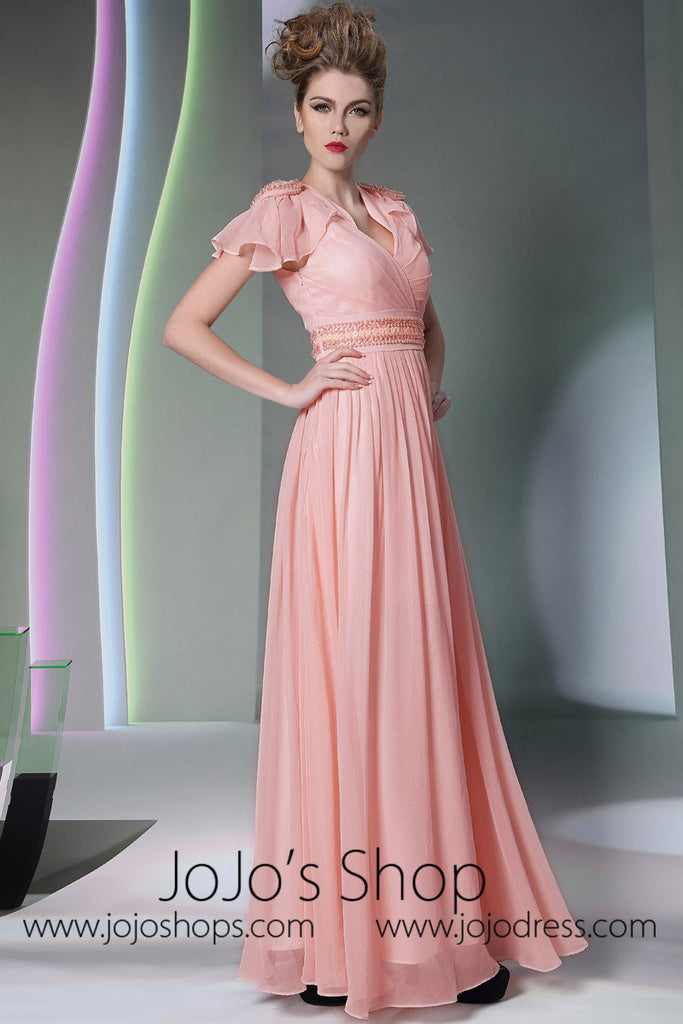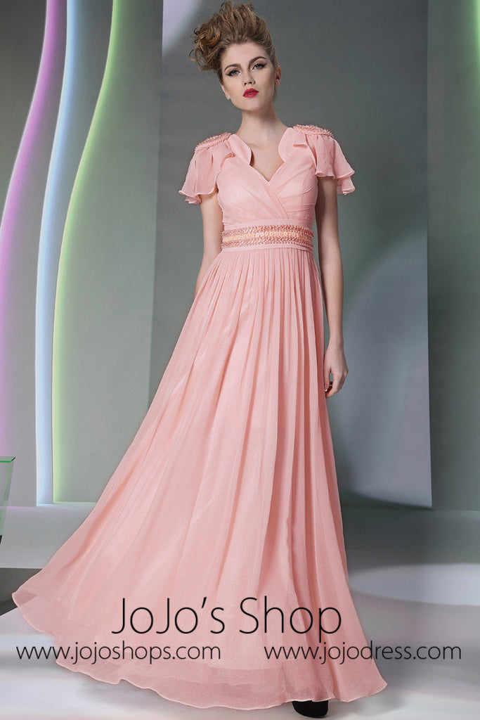 Pink V Neck Grecian Formal Prom Dress With Short Sleeves DQ830943