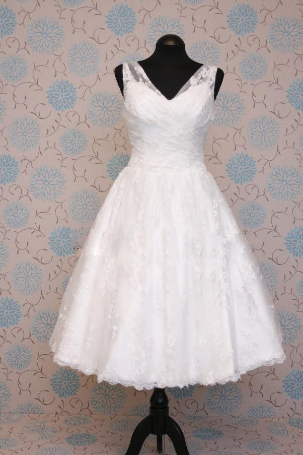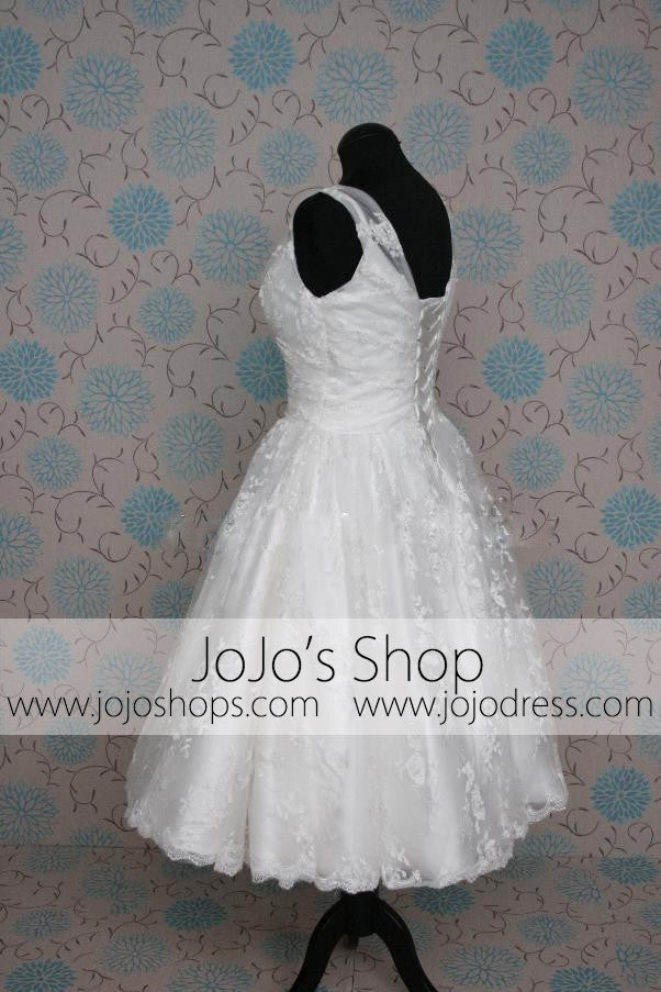 Retro 50s 60s Short Tea Length V Neck Lace Wedding Dress
